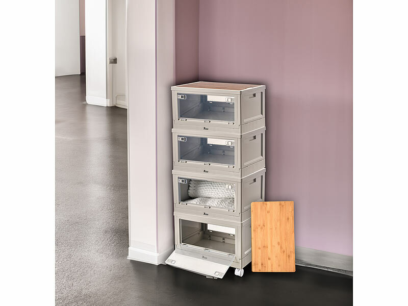Stapelbar mit flexiblem Zugriff: Ihre neuen Boxen stellen Sie einfach aufeinander und nutzen so perfekt Ihren vorhandenen Stauraum. Sie brauchen etwas aus der untersten Box? Kein Problem! Öffnen Sie einfach die seitlichen Klappen der Box. So haben Sie von zwei Seiten Zugriff und sparen sich lästiges Hin- und Herräumen.