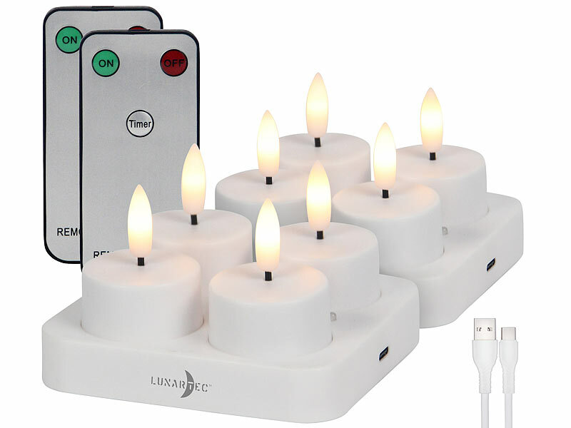 Lunartec 12er-Set LED-Akku-Teelichter mit USB-Ladestation, Fernbedienung, Timer