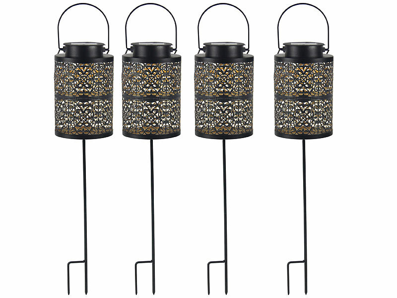 Lunartec LED Solar Laterne außen: 4er-Set Metall-Solar-Laternen stehend, hängend & mit Erdspieß, IP44