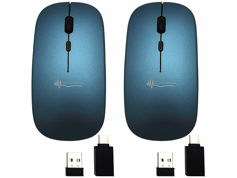 GeneralKeys USB Maus: 2er-Set Flache Akku-Mini-Maus mit Bluetooth 5.2 & 2,4 GHz, graublau