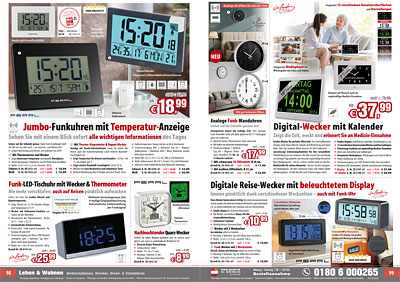 | Produktgruppe: Wanduhren mit Quarzwerk und Zifferblatt-Beleuchtung von € 12,99 bis € 22,99 | Produktgruppe: Analoge Tisch- und Wanduhren von € 11,05 bis € 12,99 |