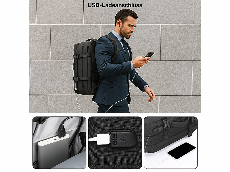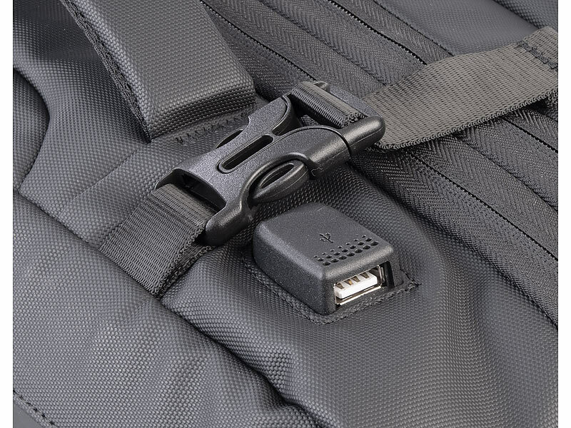 Cleveres Design: Sollte nach einem ungeplanten Shoppingtrip doch einmal der Platz eng werden, ist das für den Reiserucksack kein Problem! Einfach den Reißverschluss aufziehen und der Rucksack dehnt sich bis zu 10 cm aus! Ihr USB-Kabel verbinden Sie einfach mit dem integrierten USB-Anschluss. So laden Sie Ihr Smartphone ganz einfach unterwegs und verstauen Ihre Powerbank praktisch im Rucksack.