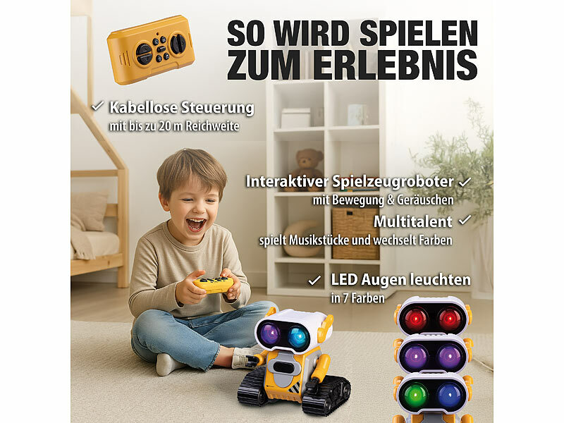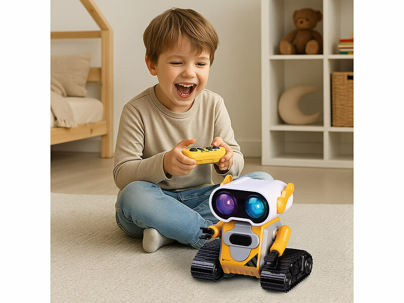 Cooles Multitalent für Ihre Kleinen: Dieser ferngesteuerte und wiederaufladbare Spielzeug-Roboter bringt Freude in jedes Kinderzimmer! Der kleine Multitalent-Roboter sorgt für abwechslungsreiche Unterhaltung mit vielen verschiedenen Funktionen. Das Highlight sind seine LED-Augen, die in sieben verschiedenen Farben leuchten und damit ein lustiges Farbspiel garantieren. So wird jeder Moment mit dem Roboter zu einem interaktiven Erlebnis. In seinem leuchtenden Gelb ist er zudem ein echter Hingucker.