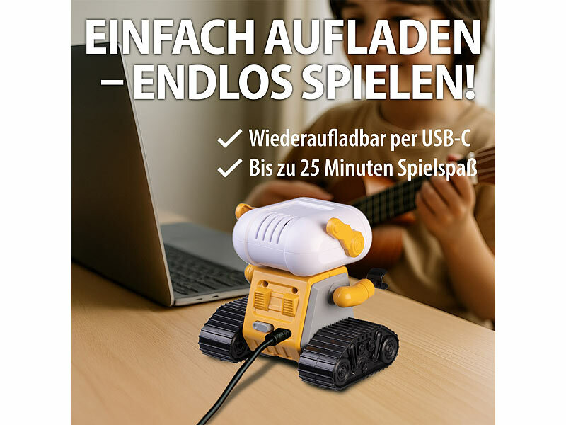 Wiederaufladbar und ferngesteuert: Der wiederaufladbare Akku sorgt für ein kabelloses Vergnügen und wird einfach per mitgeliefertem USB-C aufgeladen. Mit der Fernbedienung wird der Roboter gesteuert und befehligt. Ob der kleine Maschinenmensch sympathische Geräusche, Musik machen oder sich bewegen soll - die Funktionen werden einfach per Fernbedienung gesteuert!