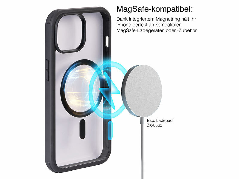 MagSafe-kompatibel: Dank integriertem Magnetring hält Ihr iPhone perfekt an kompatiblen MagSafe-Ladegeräten oder -Zubehör, ohne dass Sie es aus der Hülle nehmen müssen. Heften Sie es einfach an entsprechende Halterungen oder legen Sie es auf Ihre MagSafe-Ladestation für stabiles und effizientes Strom tanken.