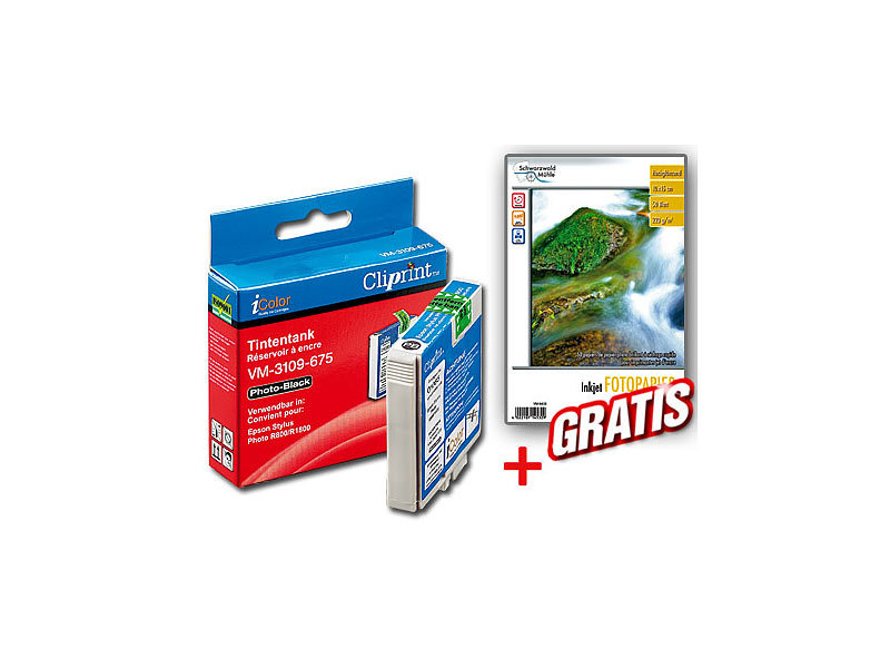 Cliprint iColor Tintentank für EPSON (schwarz) + Fotopapier GRATISJetzt Cliprint gratis testen:EverBrite-Tinte inklusive Modifier&FotopapierProduktbeschreibung: