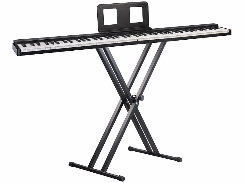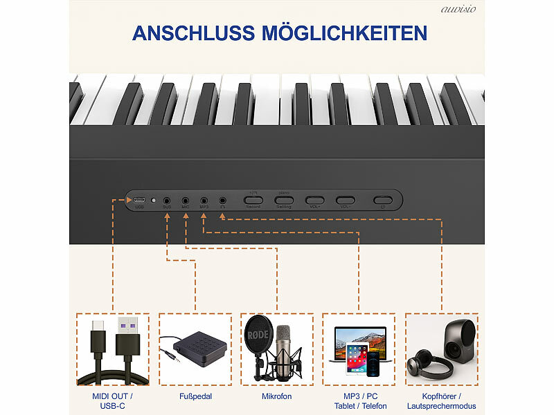 Faltbares Klavier inklusive Sustain-Fußpedal, Notenständer, USB-Ladekabel (USB-C auf USB-A), Transporttasche, doppelstrebigem E-Piano-Ständer mit Befestigungsriemen und deutscher Anleitung