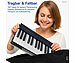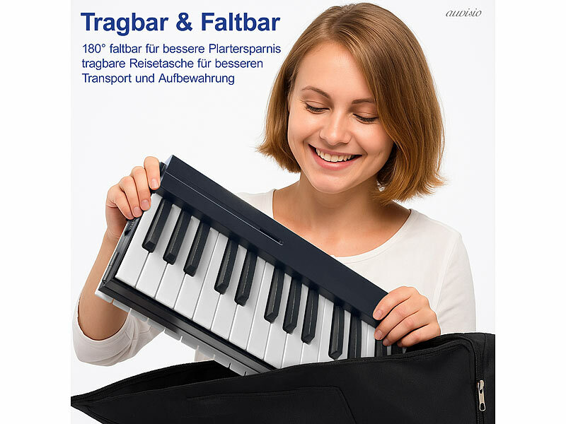 Platzsparend und tragbar: Das innovative Design lässt sich platzsparend zusammenfalten. Im Handumdrehen verschwindet das Klavier in der robusten Transporttasche - ideal für den mobilen Einsatz. Perfekt für den Musikunterricht, kleine Wohnzimmer oder spontane Sessions unterwegs.