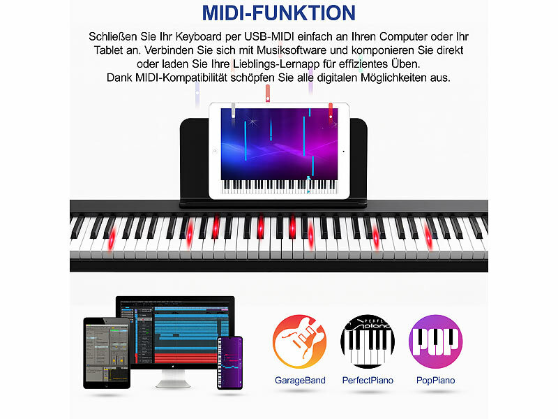 Unkomplizierte Integration mit Technik: Schließen Sie Ihr Keyboard per USB-MIDI einfach an Ihren Computer oder Ihr Tablet an. Verbinden Sie sich mit Musiksoftware und komponieren Sie direkt - oder laden Sie Ihre Lieblings-Lernapp für effizientes Üben. Dank MIDI-Kompatibilität schöpfen Sie alle digitalen Möglichkeiten aus.