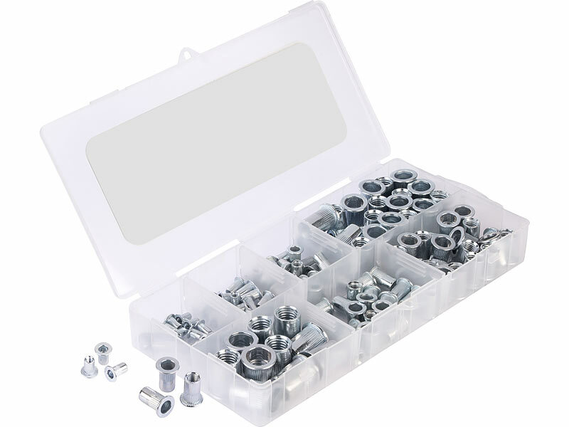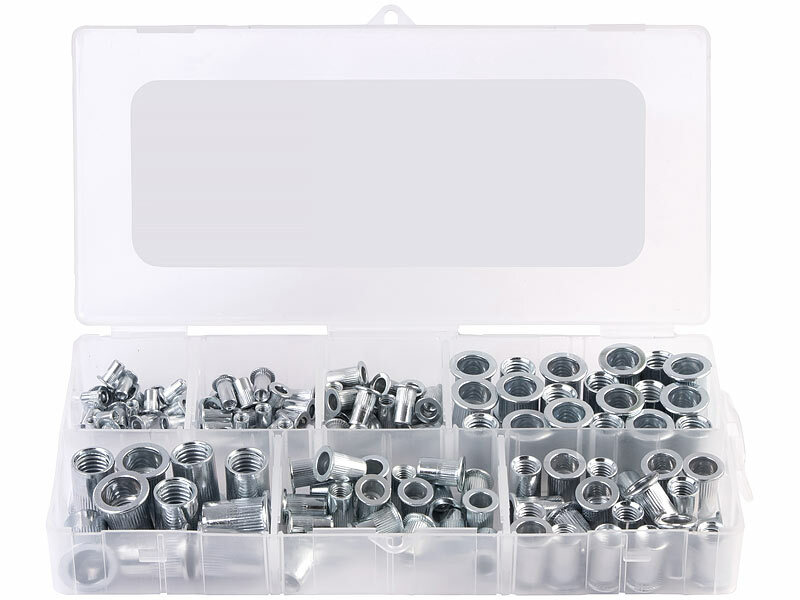 250-teiliges Nietmuttern-Sortiment mit 7 Größen: je 70x M3, 40x M4, 50x M5, 50x M6, 20x M8, 10x M10 und 10x M12