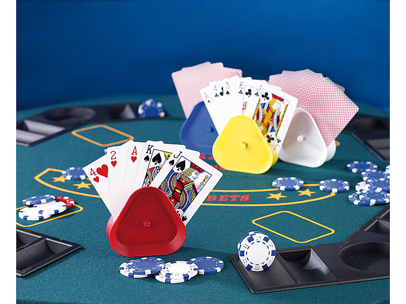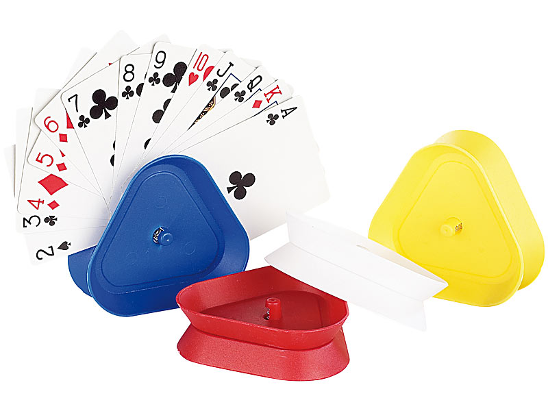 Einfach in den Halter gesteckt, rutschen die Karten nicht mehr aus dem Handfächer. Jeder der 4 Halter hält über 2 Dutzend Karten und steht auf Wunsch auch frei auf dem Tisch.