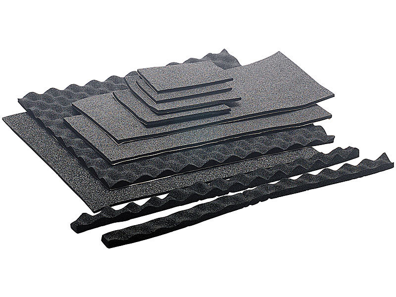 10 selbstklebende Spezialmatten: 400x350x15 mm, 400x350x5 mm und 400 x 180 x 50 mm (2x) für Gehäuse, 150 x 140 x 5 mm, 150 x 85 x 5 mm (je 2x) für Netzteil, 2x 500x25x15 mm Wickelmatte für Lüfter