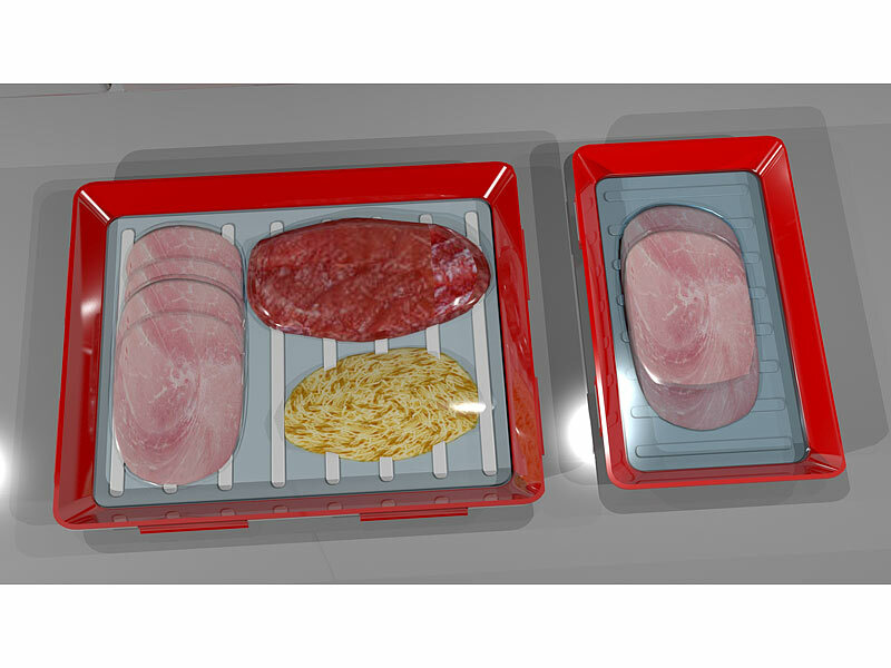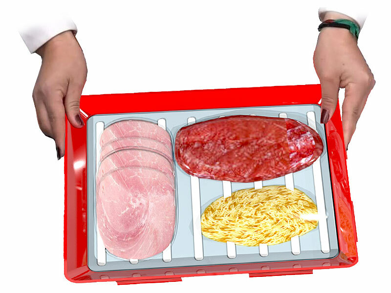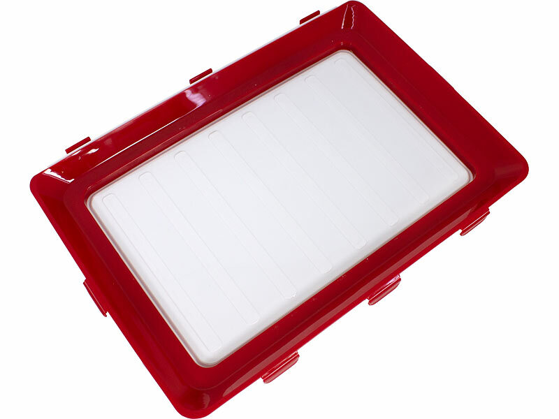 Kinderleichte Verwendung: Legen Sie Ihre Lebensmittel einfach in das Unterteil und klappen Sie den Deckel zu. Der extrem flexible Foliendeckel sorgt dabei für einen nahezu luftdichten Abschluss.