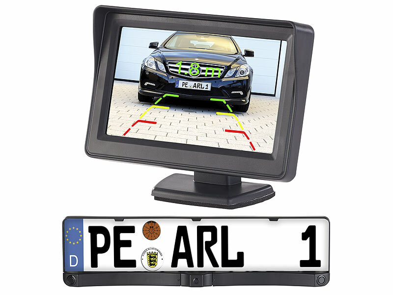 Set bestehend aus Nummernschuld-Halterung mit Kamera und Sensoren inklusive akustischem Abstandswarner, Strom-Anschlusskabel, Videokabel und Montagematerial sowie Rückfahrmonitor inklusive Strom-Anschlusskabel, jeweils inklusive deutscher Anleitung