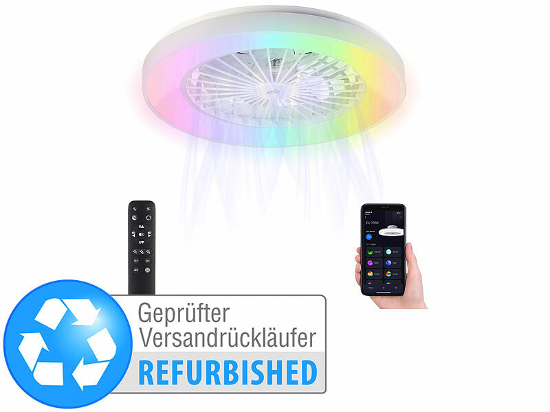 Die etwas andere Deckenleuchte: Dank Einstellungen für 16 Millionen Farben sowie für warmweiß bis tageslichtweiß haben Sie Licht, ganz wie Sie es haben wollen. Die eingebaute LED-Leuchtstärke beträgt 30 Watt, womit eine Helligkeit von bis zu 1.250 Lumen erzeugt werden kann. Zudem lassen Sie sich auf Wunsch an warmen Tagen mit einer angenehmen Brise umwehen! Die Geschwindigkeit regeln Sie einfach per App oder Fernbedienung.