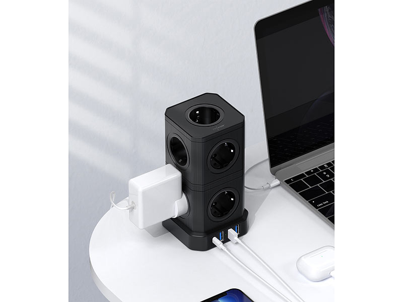 Steckdosen-Turm mit 9 Steckdosen, 3 USB-A-Anschlüssen und 1 USB-C-Anschluss