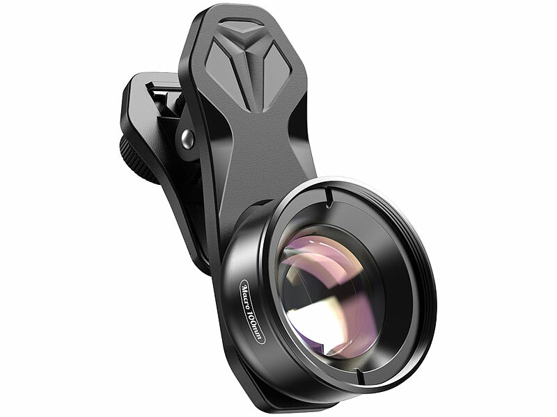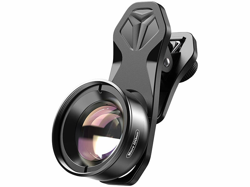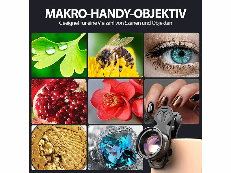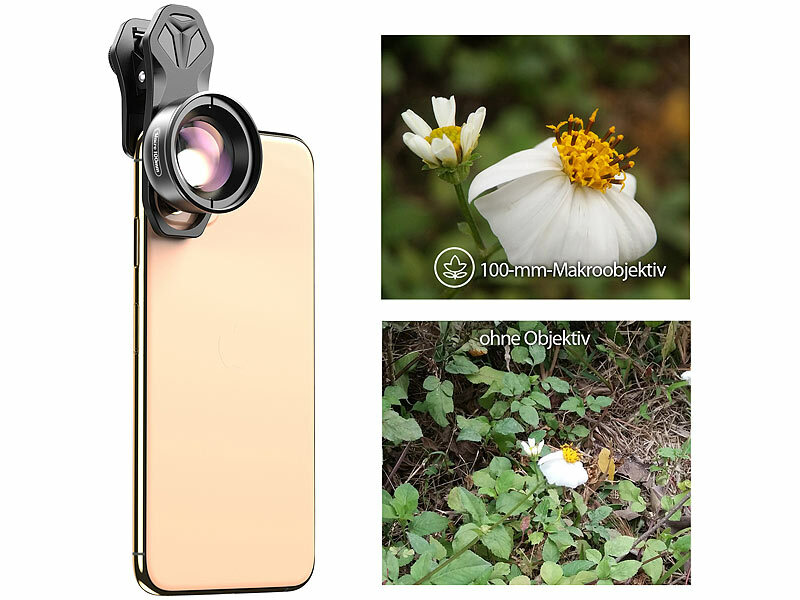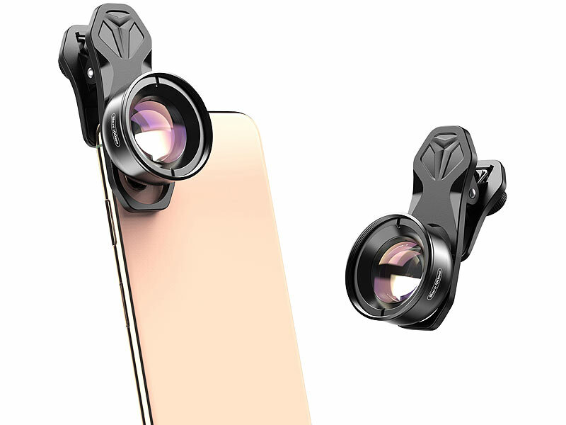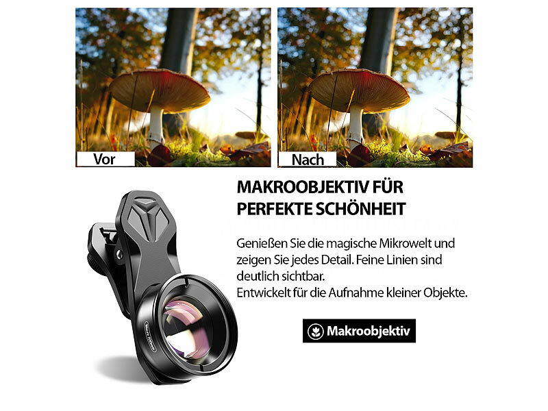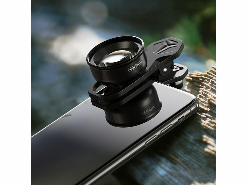 Makro-Objektiv-Vorsatzlinse inklusive Smartphone-Halterung, Transporttasche, Reinigungstuch und deutscher Anleitung - Handy-Kamera-Vorsatzlinse - Außerdem relevant oder passend zu: Lupe, Aquarium, Fotostudio