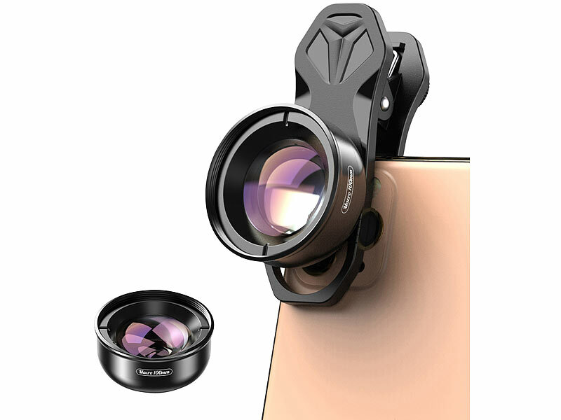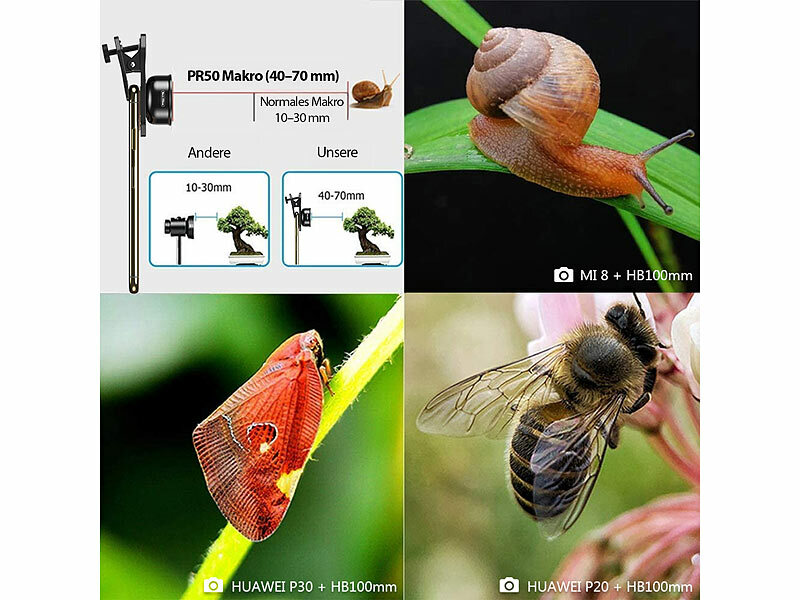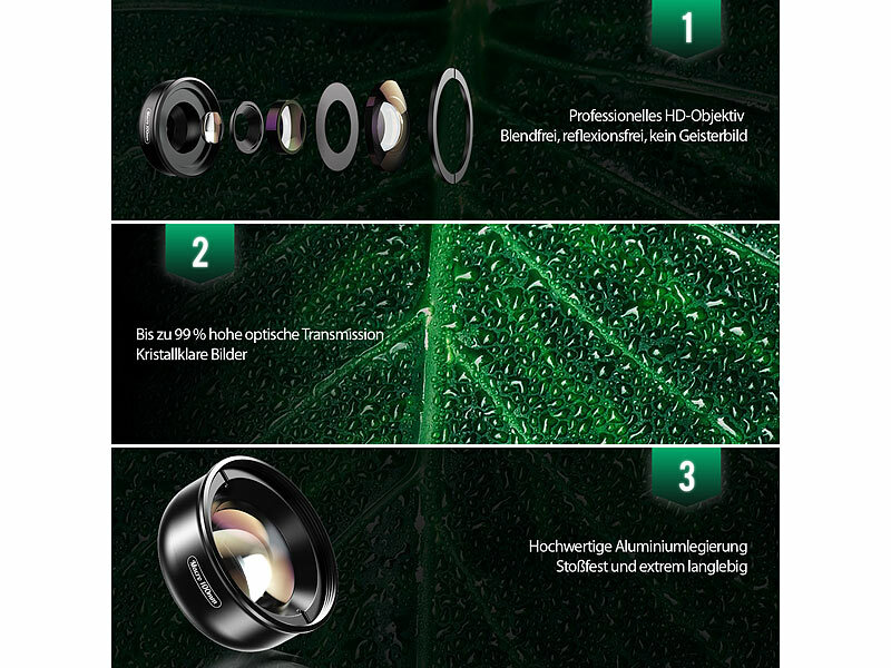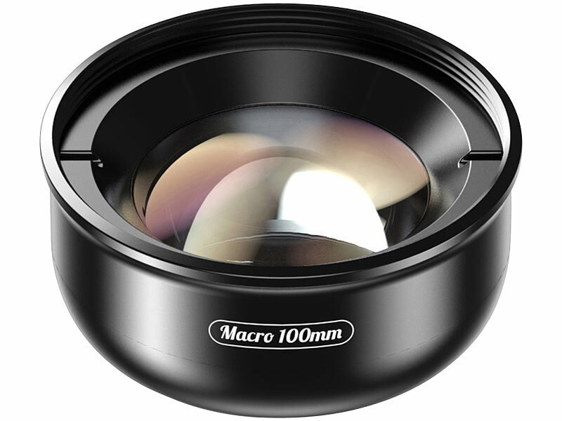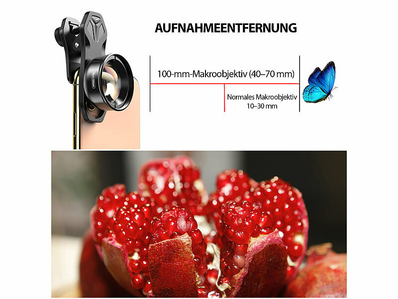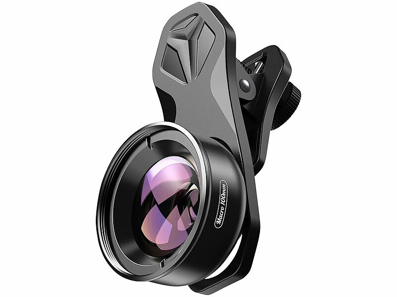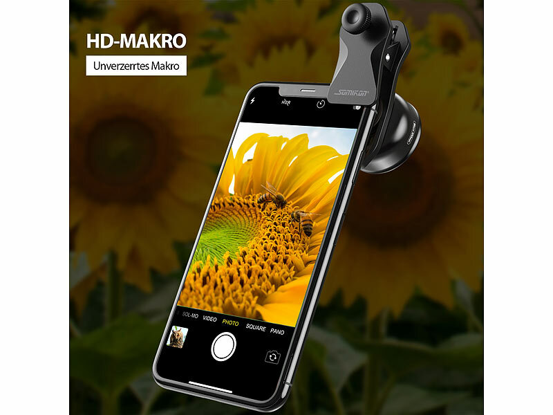 Makro-Objektiv-Vorsatzlinse inklusive Smartphone-Halterung, Transporttasche, Reinigungstuch und deutscher Anleitung - Handy-Kamera-Vorsatzlinse - Außerdem relevant oder passend zu: Lupe, Aquarium, Fotostudio