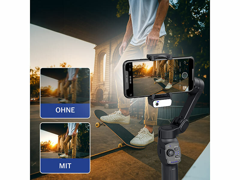Stabile Aufnahmen aus jedem Winkel: Mit dem 3-Achsen-Smartphone-Stabilisator erstellen Sie butterweiche Videos im Gehen, Laufen und beim Filmen aus der Hand. Und mit dem mitgelieferten magnetischen Tracking-Aufsatz bleiben Sie immer perfekt im Bild. Dank Füll-Licht sogar in bestem Licht!