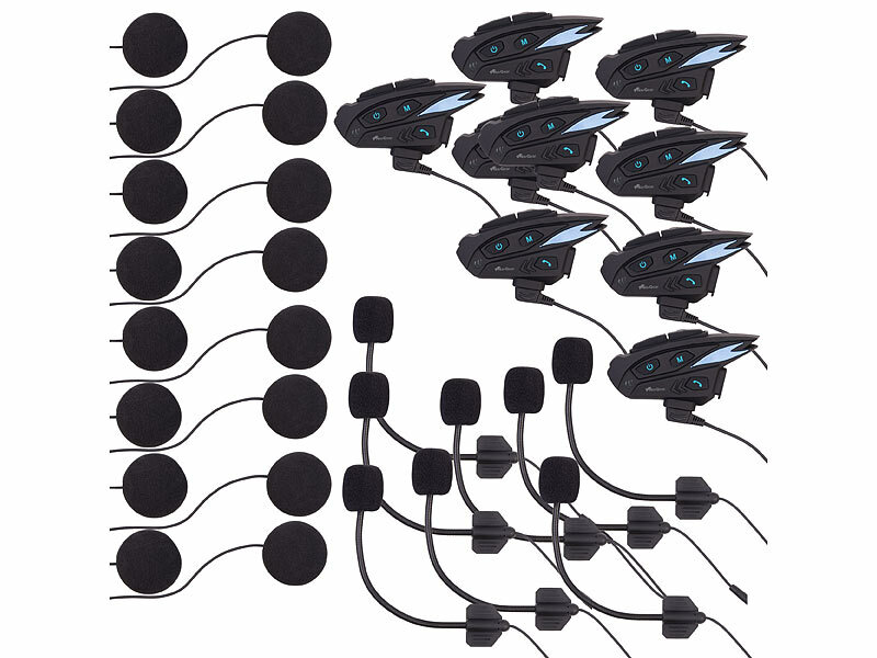 8 Kommunikations-System jeweils inklusive Ohrhörer, Mikrofon mit Windschutz, Mikrofon ohne Windschutz, Clip-Halterung für Befestigung an Helm, Halterung für Klett-Befestigung an Helm, zweiteiliges Klett-Klebepad zum Befestigen der Halterung an Helm, 4 Klett-Klebepads für Ohrhörer, 2 Klett-Klebepads zum Befestigen des Mikrofons ohne Windschutz, Klett-Klebepad für Befestigung der Mikrofon-Halterung (Mikrofon mit Windschutz), Innensechskant-Schlüssel, USB-Ladekabel (USB-C auf USB-A), 2 Farb-Applikationen und deutscher Anleitung