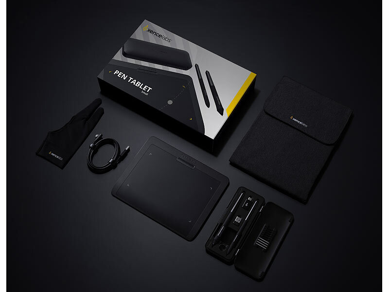 Tablet inklusive Zeichenhandschuh, Stiftetasche, 2 Stifte, USB-Kabel (USB-A auf USB-C), Dongle, Adapter USB-A auf USB-C, 6 Zeichenspitzen, 4 Filzspitzen und Spitzenabzieher
