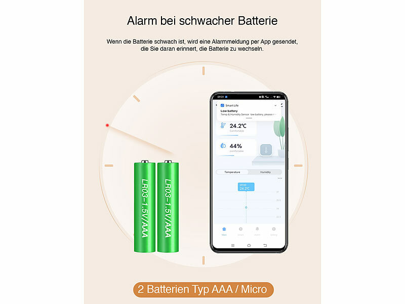 Erfassen Sie ganz einfach das Klima in Ihrem Zuhause: Mit Ihrem neuen Thermometer und Hygrometer haben Sie es immer im Blick! Denn Temperatur und Luftfeuchtigkeit lassen Sie sich bequem in Echtzeit auf Ihrem Smartphone anzeigen.