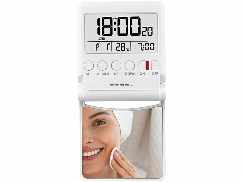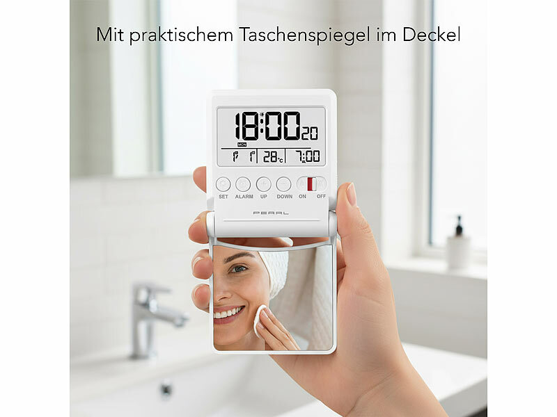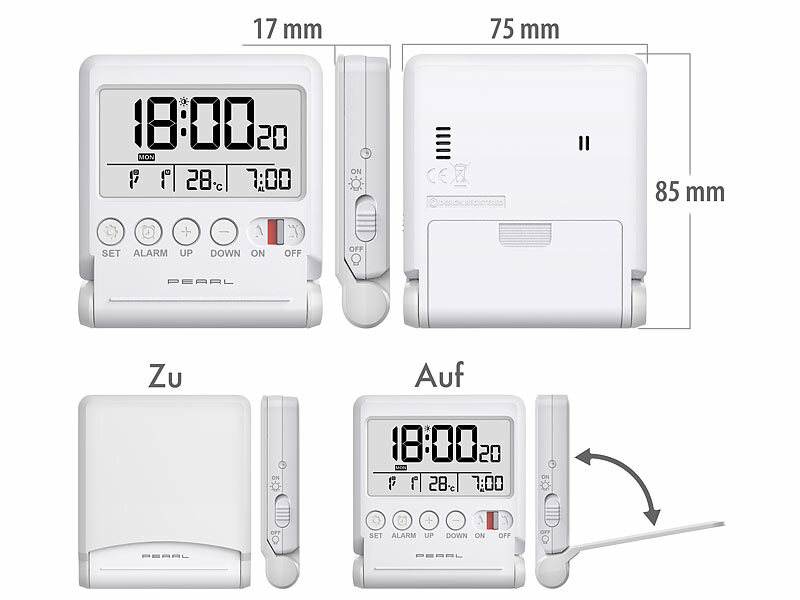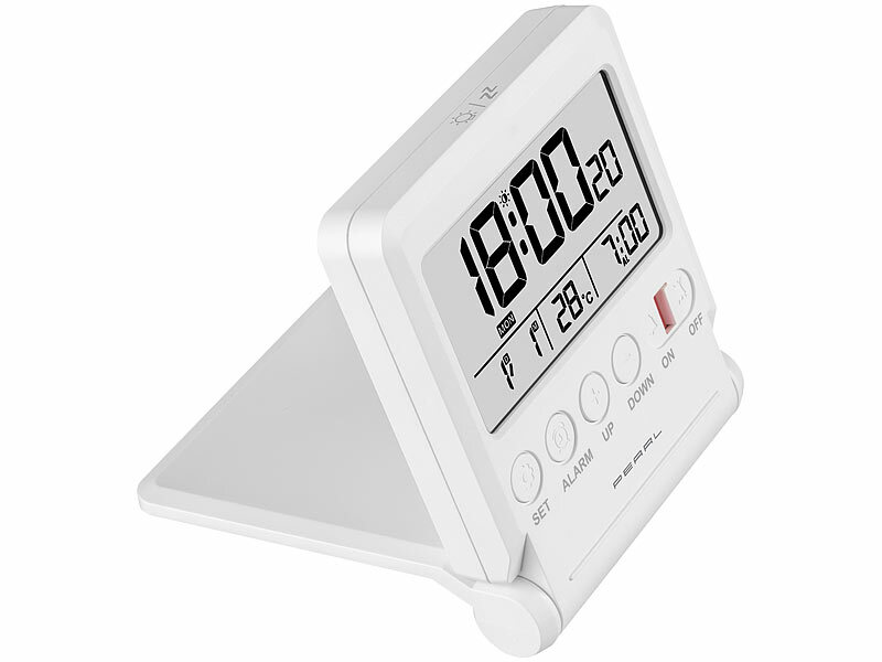 PEARL Reisewecker: Kompakter Reise-Funkwecker mit Thermometer und Datum, klappbar