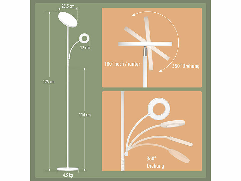 Lunartec LED-Stehlampe mit Leselampe, Fernbedienung, 2.800 lm, dimmbar, schwarz