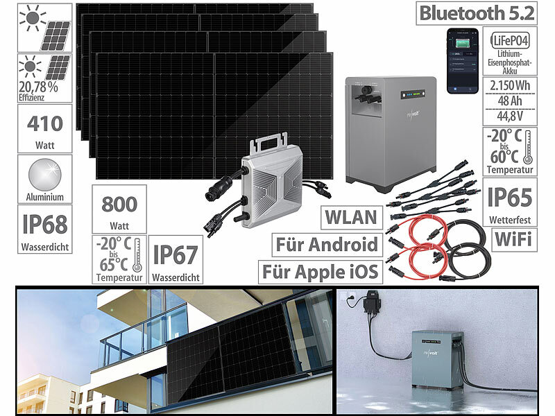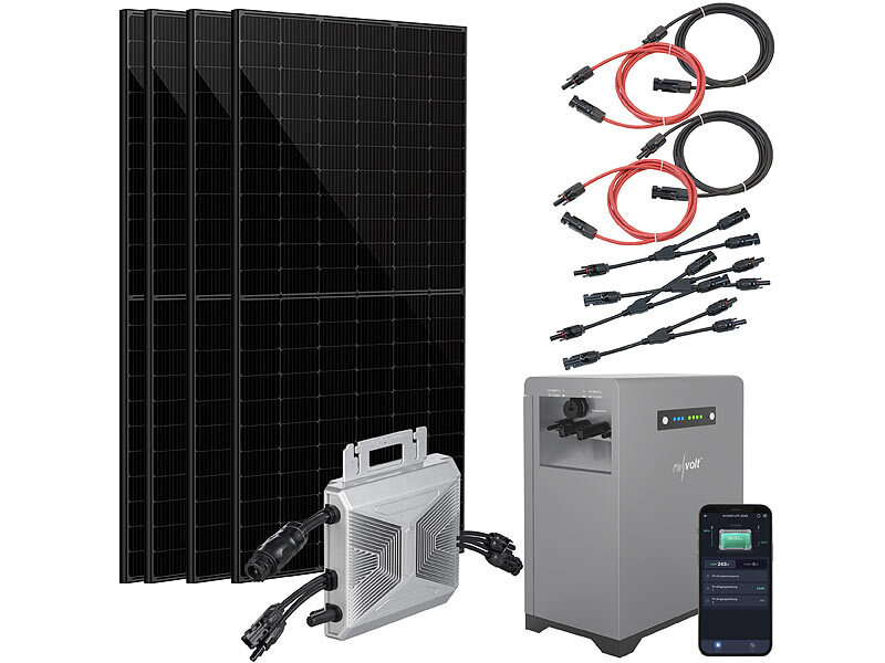 Stromkosten sparen leichtgemacht: dank dieses Solarstrom-Komplettpakets für Ihr Zuhause! Schließen Sie die Solarmodule an den Akku, diesen an den Microinverter und letzteren an Ihr Hausstromnetz an. Schon lädt Solarstrom den Akku und versorgt gleichzeitig Ihre Hausgeräte Tag und Nacht mit Strom.
