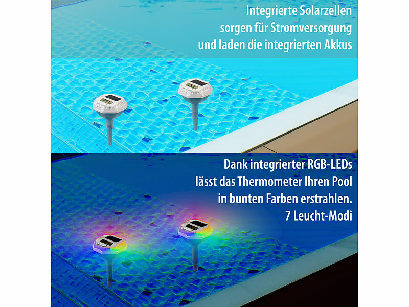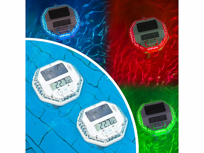 infactory 3in1-Poolthermometer, Chlor-Dosierer und RGB-Leuchte, Solar, Akku, LCD
