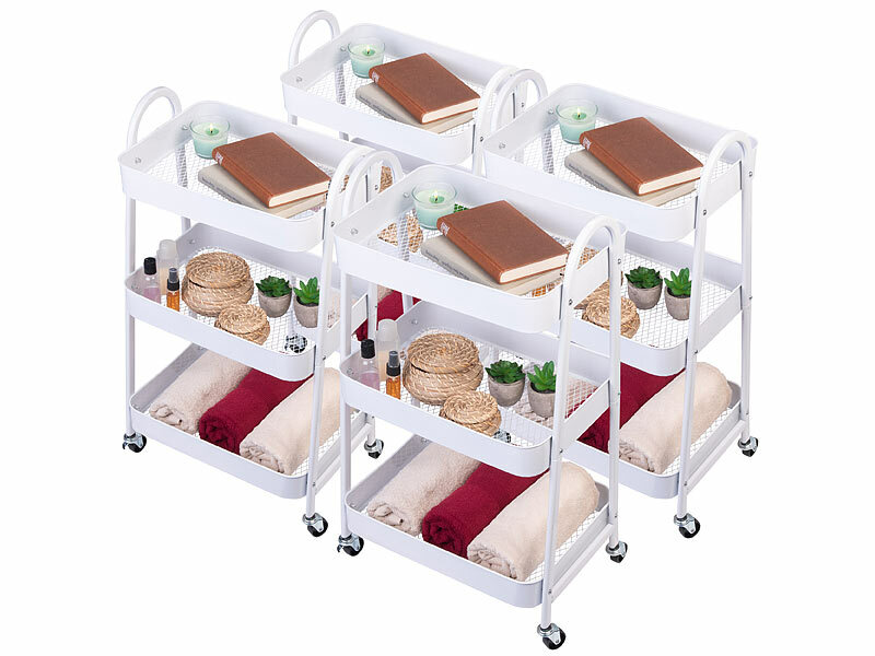 4 Aufbewahrungs-Rollwagen bestehend aus je 3 Ablagefächer, 2 Stangen, 2 Griffstangen, 4 Räder, Montagematerial und inklusive deutsche Anleitung - Aufbewahrungsregal - Außerdem relevant oder passend zu: Einlagen, Handtuch, Organizer