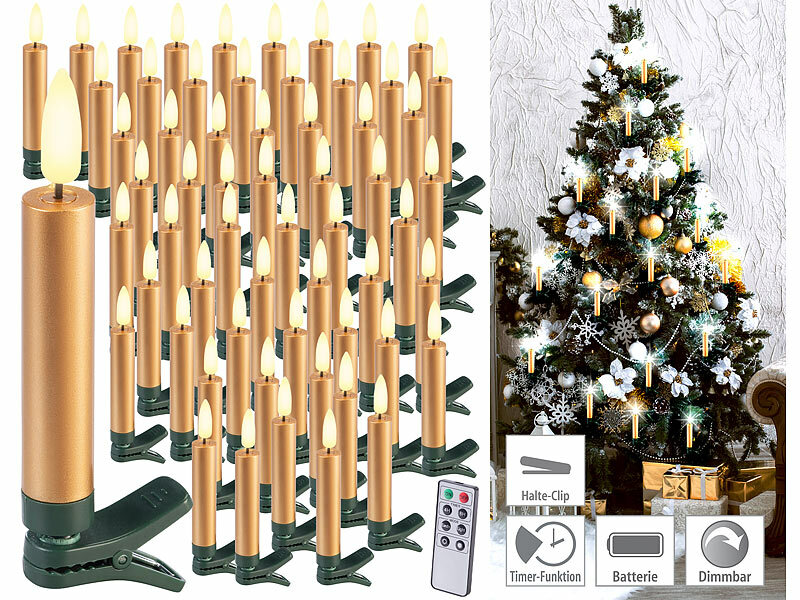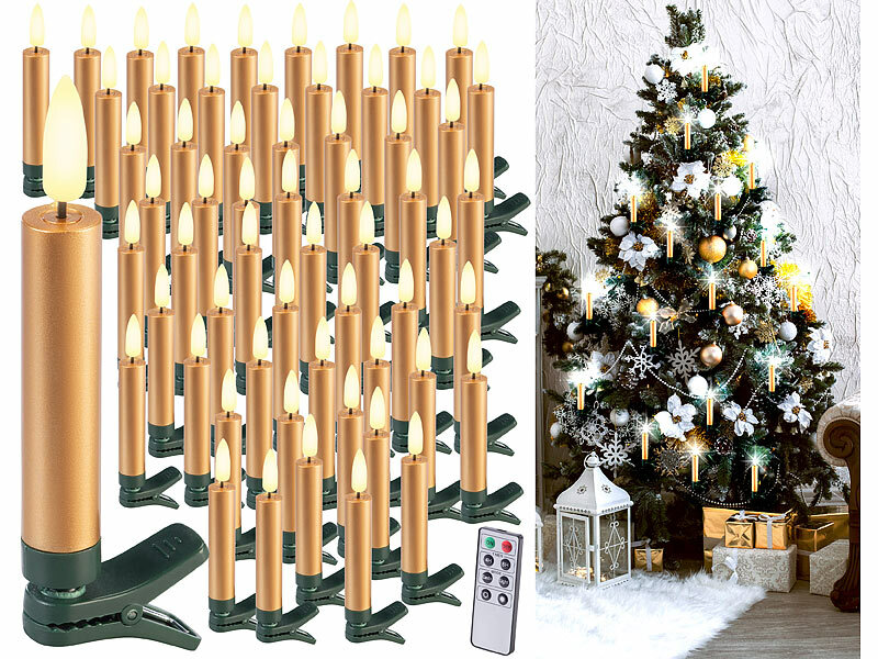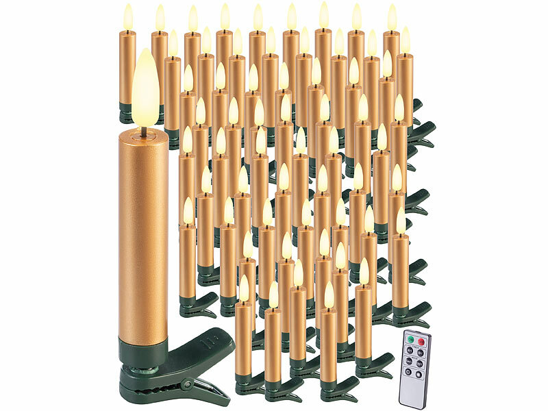 Lunartec LED Baumkerzen kabellos: 60er-Set LED-Weihnachtsbaumkerzen mit täuschend echter Flamme, gold