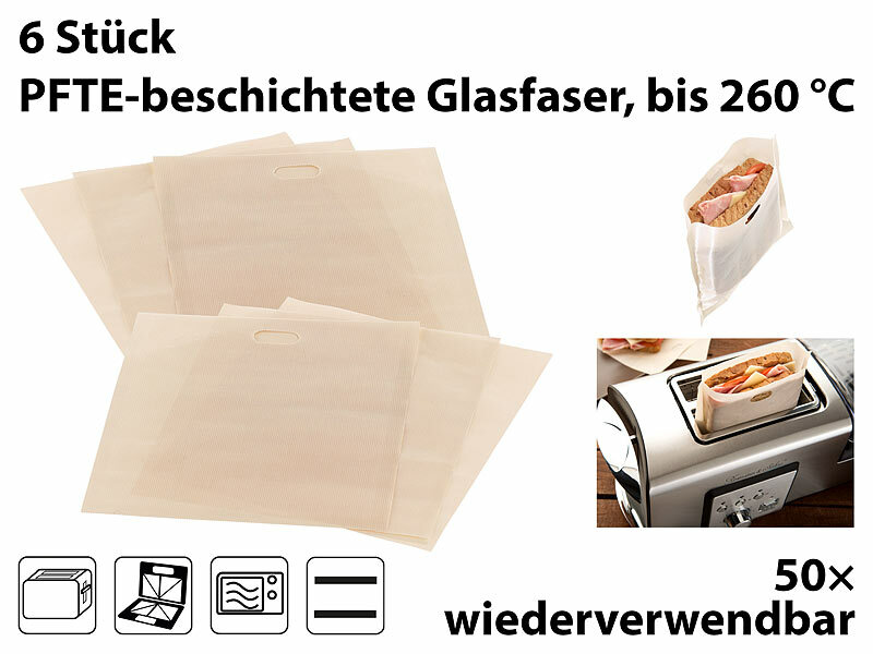Rosenstein & Söhne Sandwichmaker-Beutel: 6er-Set Dauer-Antihaft-XL-Toastbags für Toaster, Mikrowelle, Backofen
